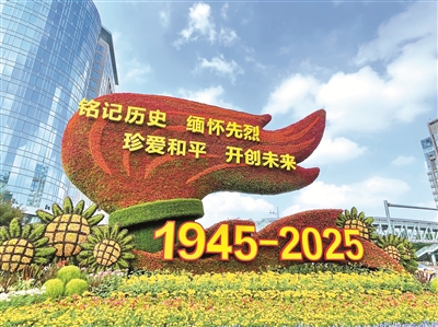 圖為紀(jì)念中國人民抗日戰(zhàn)爭(zhēng)暨世界反法西斯戰(zhàn)爭(zhēng)勝利80周年主題花壇。