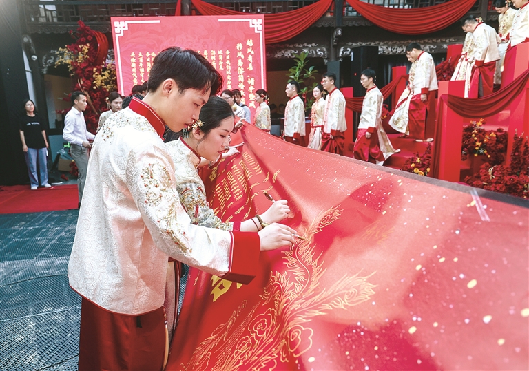 風成于上、俗化于下。近年來,越來越多新人選擇集體婚禮,倡導文明簡約的婚嫁理念,通過精心設計的集體婚禮儀式,打造既莊重又溫馨的婚禮體驗,既減輕經濟負擔、又傳承美好家風,倡導婚俗改革文明新風尚。圖為在浙江省諸暨市西施故里景區(qū)內,參加集體婚禮儀式的新人們簽訂移風易俗簡婚承諾。新華社記者 徐昱 攝