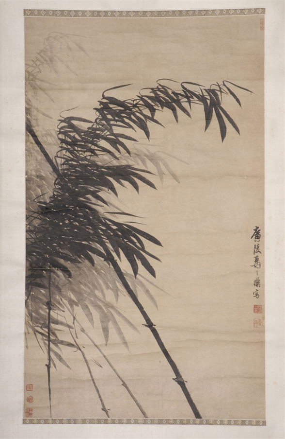 清代,縱高102厘米,橫寬60厘米。作者運(yùn)筆逆來(lái)順往,橫涂豎抹,濃墨勾節(jié),淡墨寫(xiě)葉,濃淡相生。在疾風(fēng)的鼓蕩下,健竹一竿逆風(fēng)巋然,嫩竹三枝不彎不揖,枝葉順風(fēng)飛揚(yáng)而不折。禹之鼎,字尚吉,一字尚基,號(hào)慎齋。廣陵(今江蘇興化)人,后寄籍江都(今江蘇揚(yáng)州)。清康熙二十年(1681年)官鴻臚寺序班,以畫(huà)供奉入暢春園。善畫(huà)人物、山水,尤精寫(xiě)真。
