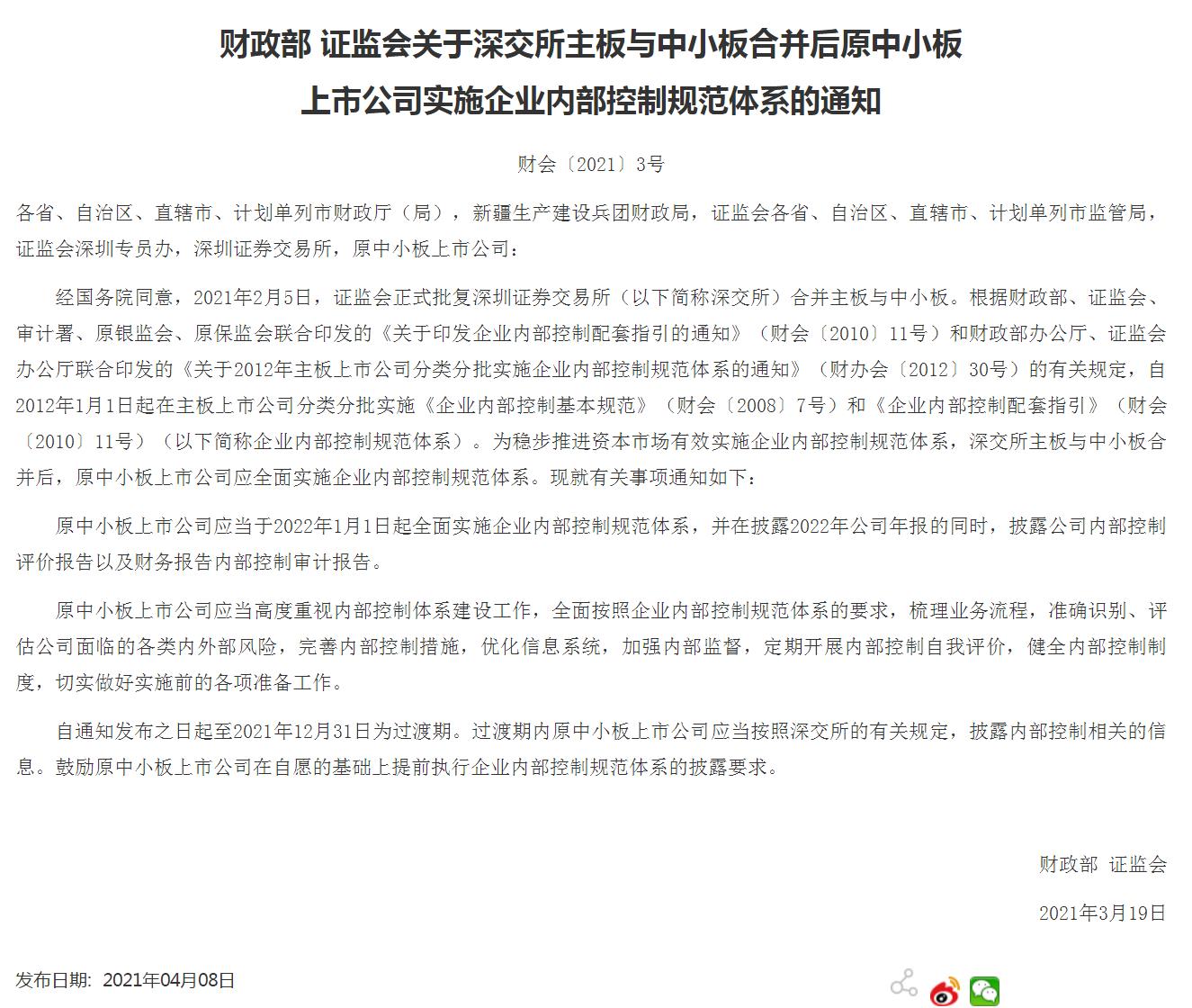 兩部門(mén):原中小板公司2022年1月1日起實(shí)施內(nèi)控規(guī)范體系