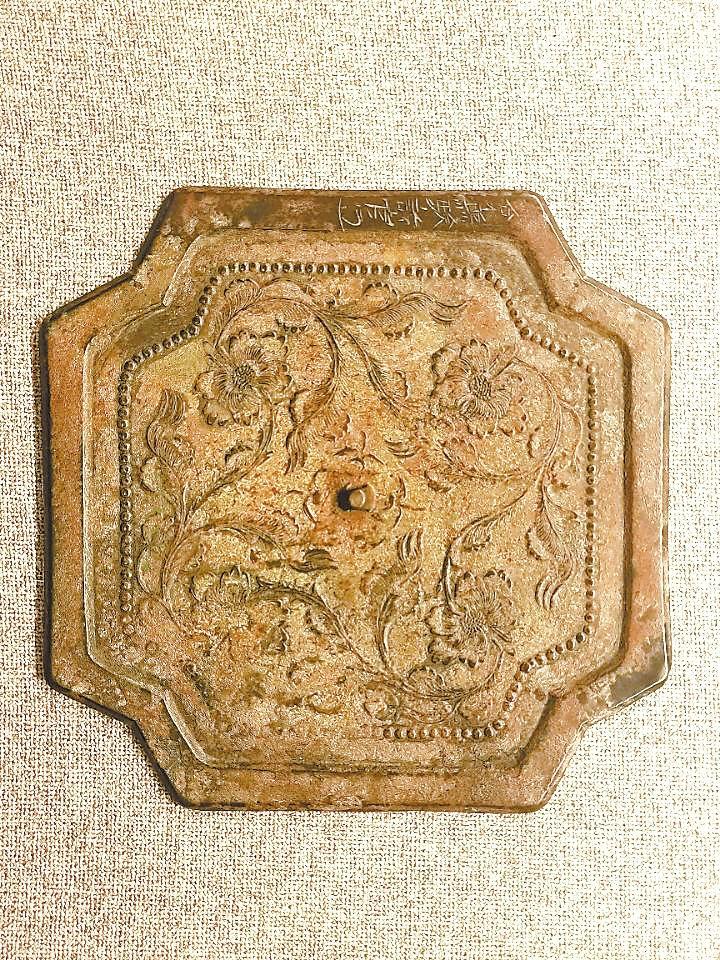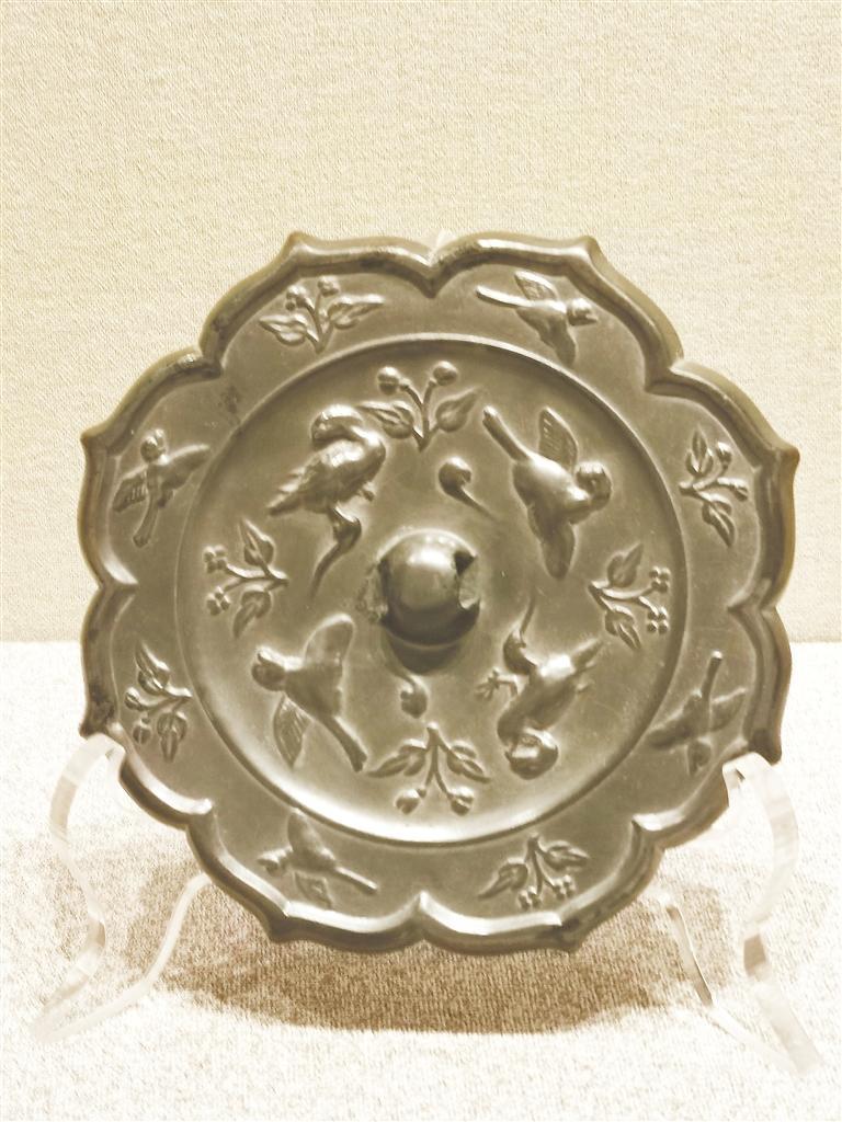 平?jīng)鍪胁┪镳^藏,唐代,八瓣菱花形,內(nèi)切圓形,圓鈕。上下左右交隔對(duì)稱(chēng)分布四只鸞鳥(niǎo)、四枝二葉二苞折枝花。