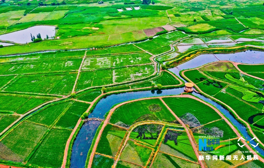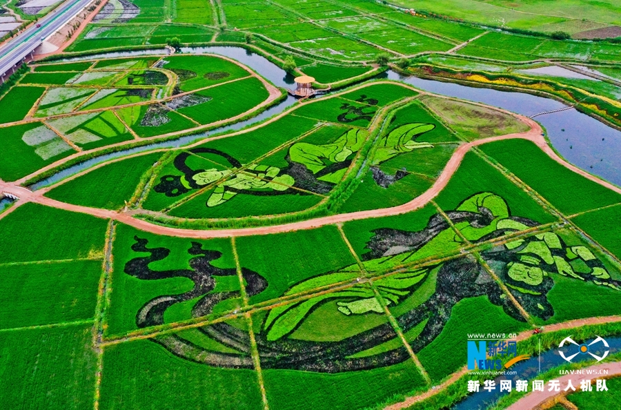 13日清晨,一場(chǎng)小雨過(guò)后,朝陽(yáng)照射在甘肅省張掖市甘州區(qū)烏江鎮(zhèn)新河田園綜合體稻田景觀區(qū)內(nèi),2000多畝稻田中一幅幅稻田畫(huà)栩栩如生,從高處俯瞰,田園風(fēng)光和生態(tài)美景展現(xiàn)在人們眼前。
