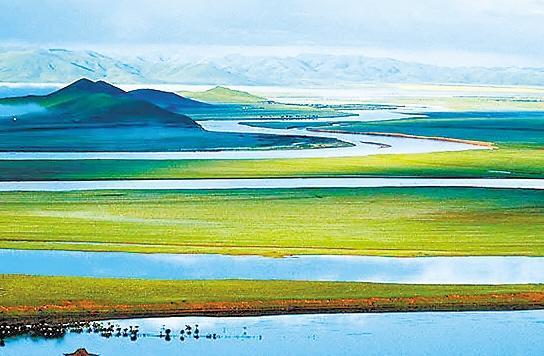 黃河從青藏高原巴顏喀拉山脈發(fā)源后,一路蜿蜒東流,從青海久治縣門堂鄉(xiāng)進入甘肅甘南藏族自治州瑪曲縣木西合鄉(xiāng)境內(nèi)后,在阿尼瑪卿山與西傾山之間的瑪曲草原上左沖右突,到了四川若爾蓋草原的唐克鄉(xiāng),突遇川北高山阻擋,不得不改變走向,來了個180度的大拐彎,就如同一只臂膀,將瑪曲攬入懷中,逆流向西400多公里,重返青海。這神奇的逆流一拐,便是著名的黃河九曲中的首曲倒流奇觀。