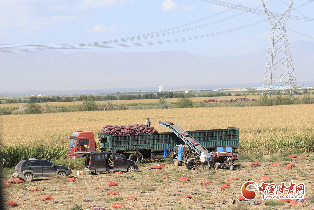 腳下有稻田,耳邊有水聲。帶著泥土的洋蔥整跺碼放,依次裝進(jìn)卡車?yán)铮r綠的高原夏菜在田間地頭收割后送進(jìn)發(fā)往南方的冷柜,百畝靑儲玉米經(jīng)過壓縮打包等待進(jìn)入牧場糧倉……祁連山下秋收正在火熱進(jìn)行中。