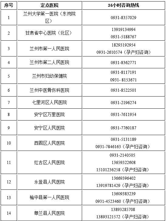 本報訊(奔流新聞·蘭州晨報記者王思璇)為進一步做好蘭州市疫情防控期間“非綠碼”患者的醫(yī)療救治工作,滿足群眾日常醫(yī)療服務(wù)需求,蘭州市動態(tài)更新并公布了市域疫情防控期間“非綠碼”定點醫(yī)院24小時咨詢熱線、醫(yī)療服務(wù)咨詢聯(lián)系電話。