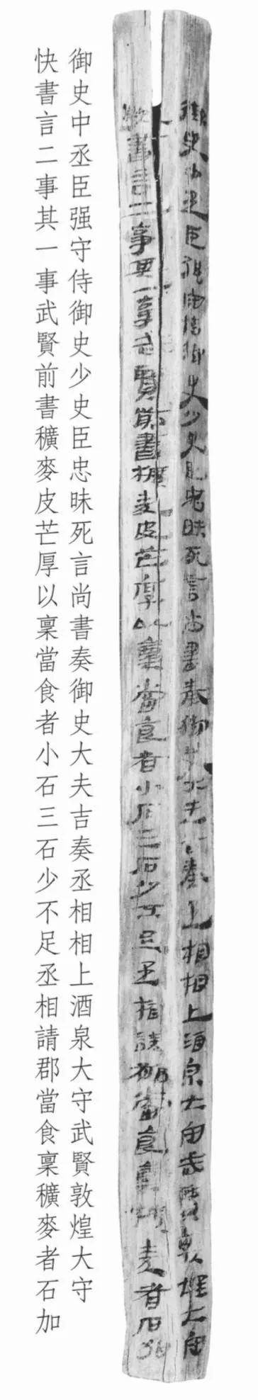 此簡為漢宣帝回復(fù)酒泉太守“辛武賢”和敦煌太守“快”奏疏的恩準(zhǔn)詔書,簡文記載的是皇帝詔書中對兩太守奏疏內(nèi)容的復(fù)述。從簡文內(nèi)容看,酒泉太守辛武賢和敦煌太守快給朝廷的奏疏主要涉及兩件事情:一是辛武賢認(rèn)為作為糧草的穬麥因皮厚芒長,如按規(guī)定每人發(fā)放小石三石,會(huì)造成實(shí)際數(shù)量的不足,所以他請求皇帝每石加發(fā)若干。另一件事顯然是敦煌太守快的上書,但文字未能容納于此簡,故不得而知。