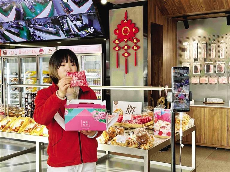 “第一次走進直播間的粉絲一定要入手玫瑰禮餅,它是采用蘭州苦水玫瑰制作的……”每天上午,位于九州中路的愛禮烘焙生活工廠店內(nèi)一角,工作人員都在直播售貨。剛走進店里就能聞到撲鼻而來的糕點香味,琳瑯滿目的商品讓人應(yīng)接不暇。