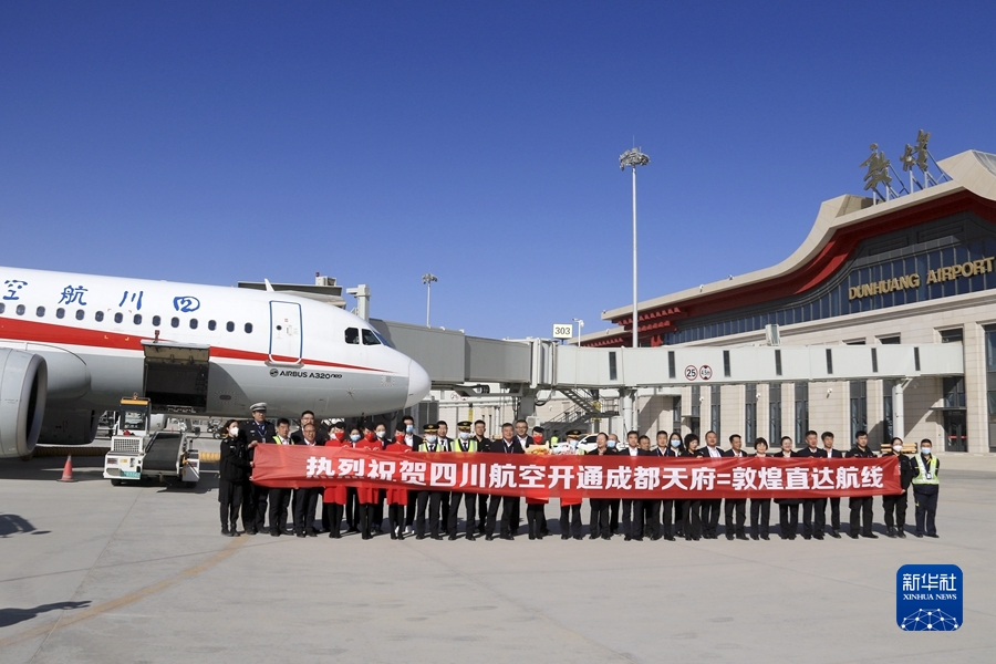 3月26日,由四川航空公司執(zhí)飛的成都至敦煌往返直達(dá)航線(xiàn)正式通航。這是首航航班機(jī)組人員與機(jī)場(chǎng)工作人員在甘肅敦煌莫高國(guó)際機(jī)場(chǎng)合影。新華社發(fā)(張曉亮攝)