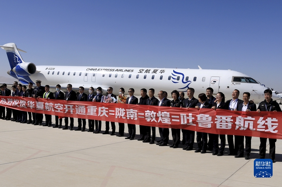 3月26日,由華夏航空?qǐng)?zhí)飛的重慶-隴南-敦煌-吐魯番往返航線(xiàn)正式通航,這是首航航班機(jī)組人員與機(jī)場(chǎng)工作人員在甘肅敦煌莫高國(guó)際機(jī)場(chǎng)合影。新華社發(fā)(張曉亮攝)