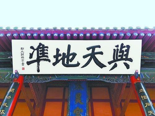 “與天地準”出自《周易·系辭傳上》。原句為:“易與天地準,故能彌綸天地之道”。準,意為等、等同(此依高亨解)。有學(xué)者或?qū)?ldquo;準”解釋為標準,或解釋為法則等,唯高解最貼原意;彌,意為遍,普遍;綸,意為絡(luò),包絡(luò)。彌綸,意即普遍包絡(luò)。此句可釋為:《易》所闡述的“性命之理”是與天地運行的自然法則等同的,所以它能夠包容天地之間萬事萬物的運行規(guī)律。匾文“與天地準”,是贊頌伏羲首創(chuàng)的八卦,高度概括了天地萬物運行之規(guī)律,為人們認識世界、改造世界提供了思想武器。