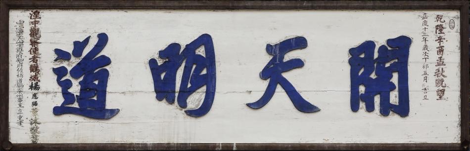 該匾懸于天水伏羲廟大門前牌坊正中。長3.5米,寬1.25米,厚0.12米。素邊,匾心白底藍字,上下款朱書。此匾有雙上款和雙下款。第一個上款為“乾隆辛酉孟秋既望”,下款為“湟中觀察使者遼海楊應(yīng)琚薰沐敬書”;第二個上款為“嘉慶十二年歲次丁卯五月吉旦”,下款為“中憲大夫?qū)幭母蜓a知秦州事王公重建”。