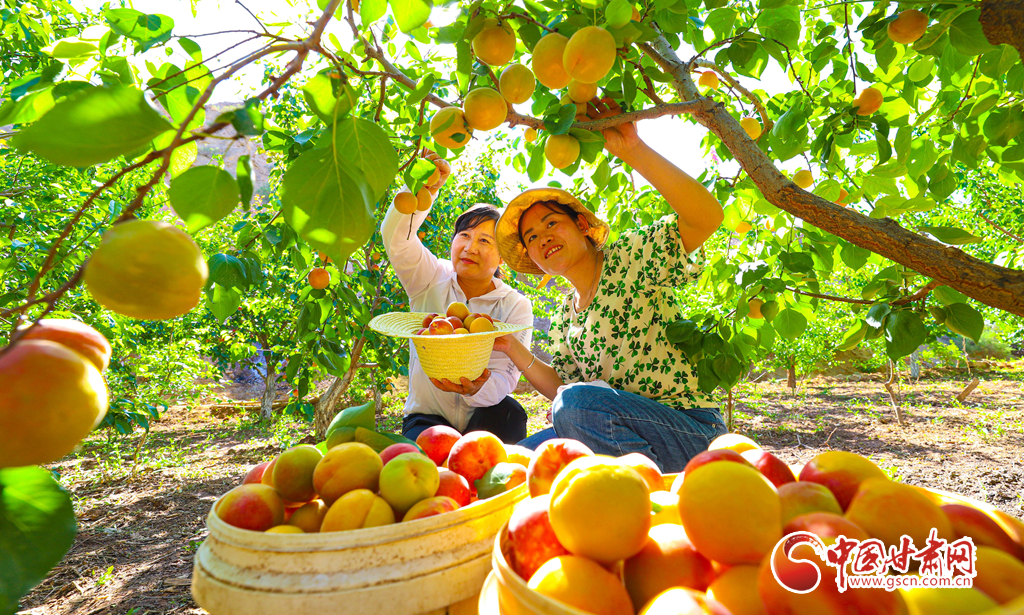 6月13日,張掖市臨澤縣板橋鎮(zhèn)友好村村民正在自己的杏園中采摘大黃杏,杏園過去的位置是一片大沙丘。