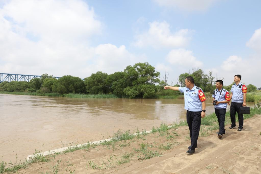 黃河派出所和黃河河務(wù)局水政監(jiān)察大隊人員對刁口河生態(tài)補(bǔ)水進(jìn)行巡查。新華社記者 劉詩平 攝