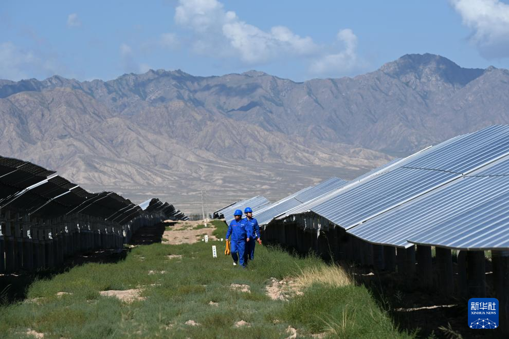 8月11日,工作人員在中國(guó)能建張掖甘州南灘30萬(wàn)千瓦光伏發(fā)電項(xiàng)目巡檢。新華社記者 金良快 攝