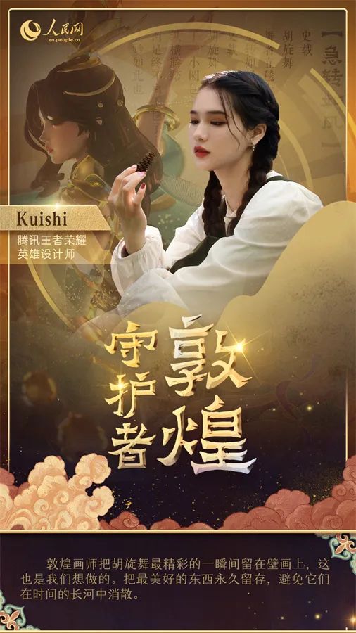在敦煌千里之外的地方,騰訊的設(shè)計師們正在研發(fā)新的敦煌文化創(chuàng)新產(chǎn)品。熱門游戲《王者榮耀》的角色美術(shù)師Kuishi以莫高窟第220窟的壁畫為原型,為游戲角色設(shè)計了全新皮膚,將盛行于唐代的胡旋舞融入現(xiàn)代元素。