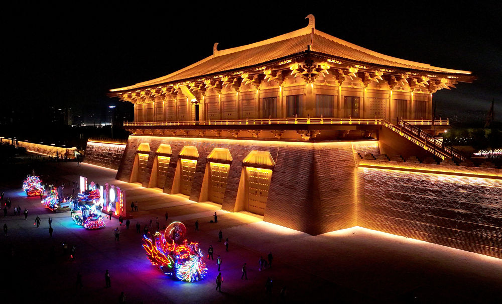 巡游彩車(chē)從西安大明宮國(guó)家遺址公園丹鳳門(mén)前駛過(guò)(2023年9月30日攝,無(wú)人機(jī)照片)。新華社記者 劉瀟 攝