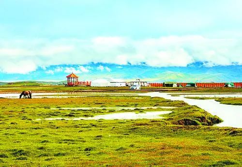 河曲馬場景區(qū)以熱爾欽濕地草原、熱爾欽湖為主要自然景觀,目前建有神駒廣場、高原馬術(shù)活動基地、步行街、親水濕地觀光平臺、星空帳篷酒店、房車帳篷營地、熱氣球觀光基地、瑪緹高端酒店等配套附屬設施。大自然在這里集高原湖濱濕地、沼澤濕地、高寒草原于一體,構(gòu)成了復合型的別樣景觀。