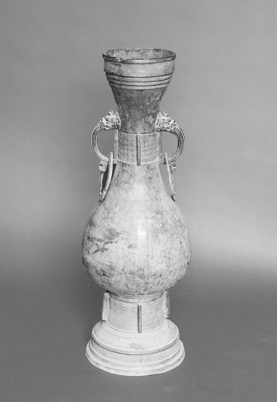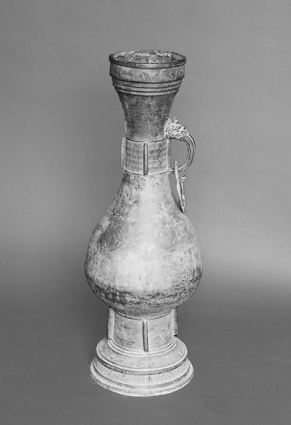 明獸面銜環(huán)耳銅瓶:該銅瓶古樸修長、厚重。銅瓶為一對,形制及紋飾相同,高0.9米,口徑0.19米,重43.86千克。直口,外卷方唇,束長頸,對稱置獨角獸吐舌形半環(huán)耳,下帶小珥,耳套如意形環(huán),垂膽形腹,束高脛,下為折肩形圈足,足口外撇,無底??谘叵嘛椚腊枷壹y,頸部飾四個等分菲棱,間以雷地紋,脛部飾四菲棱間以鱗形波浪紋,圈足飾菲棱形回紋。銅瓶原存放于崆峒山太和宮真武殿真武像前,置于韓王鼎左右。
