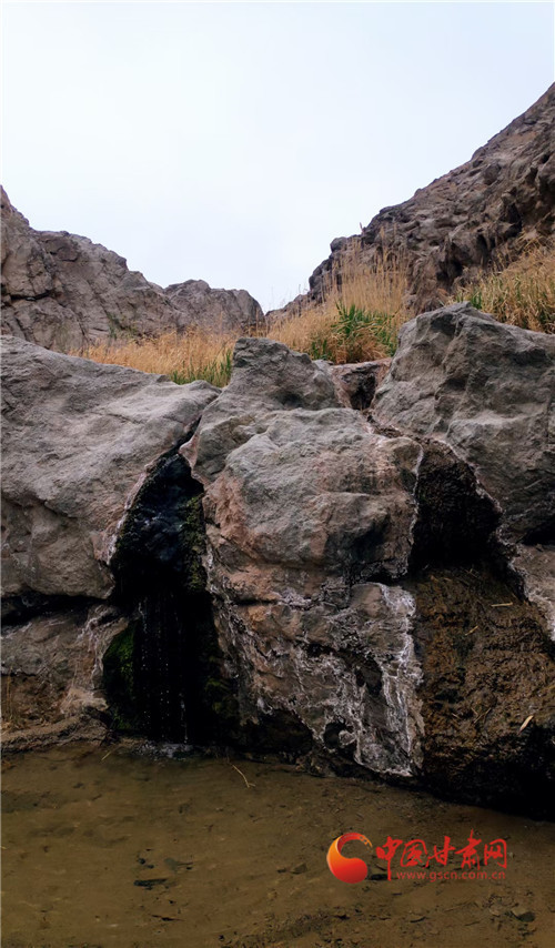 順著懸泉置遺址向峽谷前行,小路的盡頭有一片綠洲,蘆葦叢生,郁郁蔥蔥,在蘆葦于巨石之間山泉流淌源源不斷,由于山泉水從不是從地下滲出,而是從懸空流出,所有才有懸泉之名。也正是懸泉滋養(yǎng),為四周處于戈壁之中的懸泉置提供了穩(wěn)定水源,讓這里成為絲綢之路上的重要驛置。