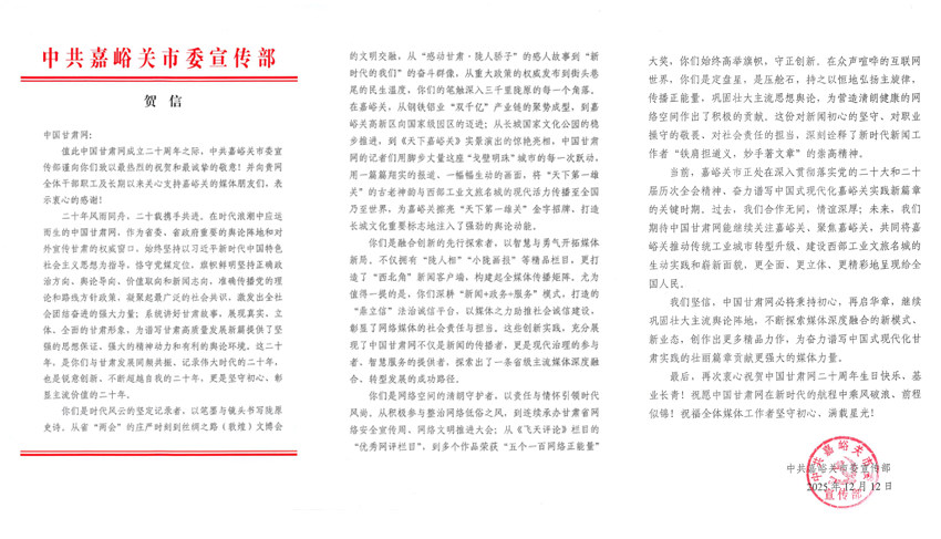 中國甘肅網(wǎng)12月12日訊(西北角·中國甘肅網(wǎng)記者 宋芳科)值中國甘肅網(wǎng)成立二十周年之際,中共嘉峪關市委宣傳部特向中國甘肅網(wǎng)發(fā)出賀函,致以最熱烈的祝賀與最誠摯的敬意,高度肯定二十年來中國甘肅網(wǎng)為嘉峪關新聞宣傳事業(yè)、輿論引導工作作出的重要貢獻,并對長期以來的支持表示衷心感謝。