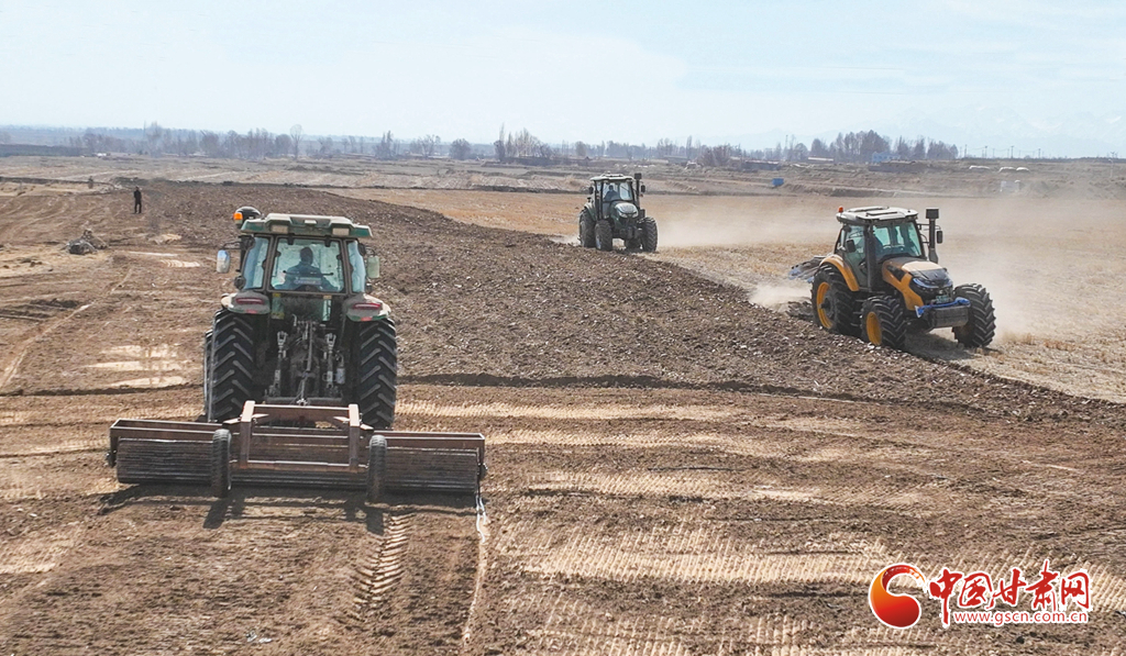 4月1日,位于祁連山下的張掖市甘州區(qū)花寨鄉(xiāng)金花寨種植專業(yè)合作社小麥種植基地里,農(nóng)戶們正在駕駛拖拉機(jī)進(jìn)行施肥、旋耕、耙地,準(zhǔn)備播種小麥。
