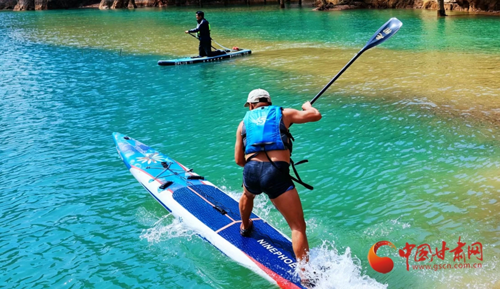 槳板愛好者們立于碧波之上,奮力揮槳,身后是炳靈寺石窟億萬年雕琢的丹霞峰林,是沉淀了1600余年的絲路文明印記。當(dāng)天,永靖縣“‘郁’見黃河·花漾永靖”郁金香文化旅游系列活動正式啟動,炳靈寺水域同步開展槳板文旅活動,成為本次春季文旅IP的核心亮點(diǎn)。