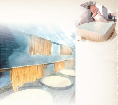 農(nóng)家豆腐講究口感,個(gè)頭飽滿的土黃豆,清冽甘甜的山泉水,酸度適中的漿水湯,農(nóng)家傳統(tǒng)的柴火灶,是必不可少的四件料。缺一樣,山野豆子就不能在清水中爆裂出植物的原香,沸騰的豆?jié){就開不出雪白的豆花兒。