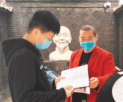 3月24日,山東省淄博市蒲松齡紀(jì)念館復(fù)工。圖為工作人員向第一批游客贈(zèng)書。 曹檸薇攝