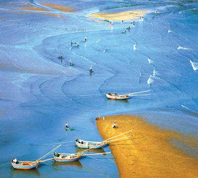 功夫不負有心人。經(jīng)過漫山遍野地毯式的尋覓,鄭德雄一行把霞浦海灘的拍攝點摸了個遍,也拍出了一幅幅漂亮的好作品。那照片上的霞浦真是美啊:藍色的海水,金色的沙灘,種海帶的竹竿依序林立,滿載的漁船停泊在靜靜的港灣,趕海人背著沉甸甸的魚簍,正走在金色的沙灘上……