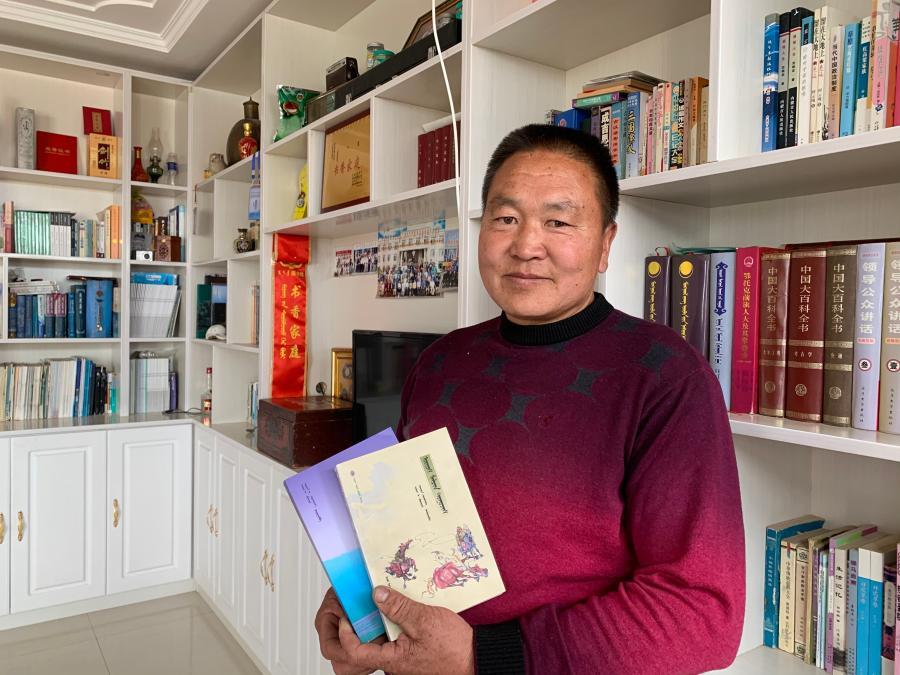“高中畢業(yè)后我回鄉(xiāng)放牧,起初想看書也找不到書,后來(lái)外出打工才讀到更多的書,收藏的書也多了。”提及往事,孟克達(dá)來(lái)仍記憶猶新,“文學(xué)書、歷史書、工具書,我全都愛(ài)讀。”