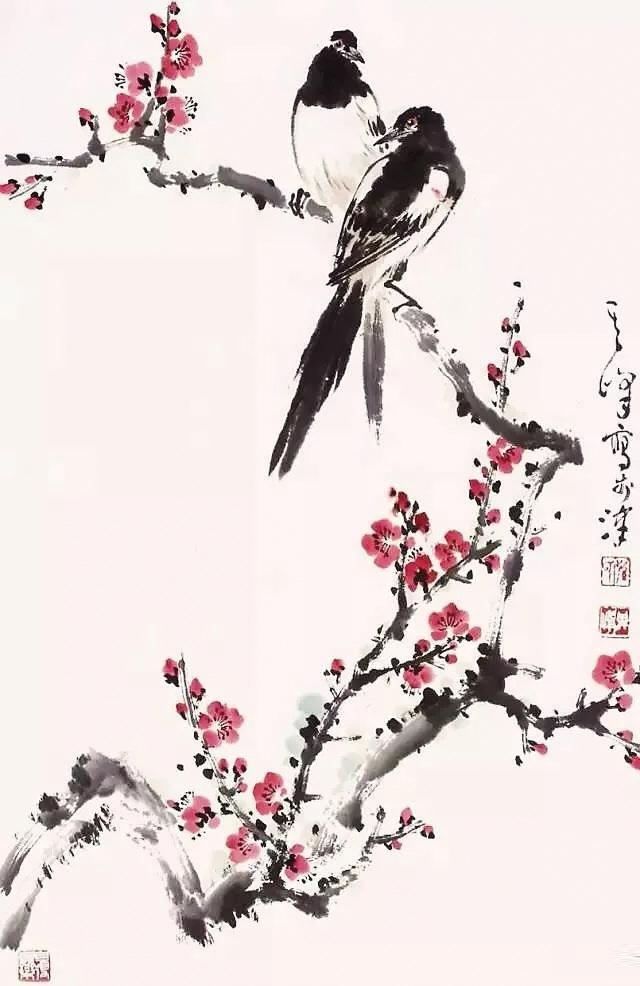 那是我第一次看見梅花,墨黑的枝干上,稀稀疏疏臥著幾朵紅紅的梅花,很安靜。畫上有四個(gè)字:傲雪紅梅。兩邊還有對(duì)聯(lián),內(nèi)容已經(jīng)不記得了。正值外面大雪紛飛,院子里已落了一層白白的積雪,一時(shí)間詩意悠然。對(duì)著那副梅花圖,清清爽爽的,令人內(nèi)心好快樂。那時(shí),我在讀《紅樓夢》,只記住了那句:琉璃世界白雪紅梅。