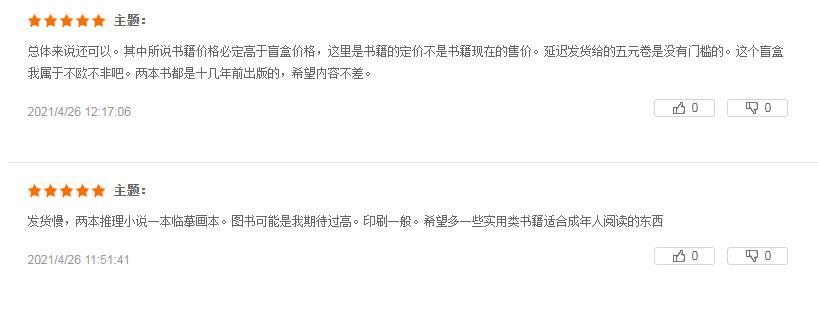 有“歐氣”讀者抽到隱藏款:“等了好久終于收到了,我收到的書(shū)都有塑封,不錯(cuò)不錯(cuò),書(shū)的豆瓣評(píng)分都在七八分左右。”“抽到了隱藏款,開(kāi)心,是一套推理小說(shuō)。”;也有人感到書(shū)籍不盡人意:“選書(shū)有點(diǎn)失望都是舊書(shū)的感覺(jué),一本《餌室》,一本《紅色棺材之謎》,有點(diǎn)臟,也能接受,送的文創(chuàng)本子很好看,書(shū)袋也不錯(cuò),買(mǎi)兩個(gè)盲盒都是一樣的文字,不同的顏色,這個(gè)有點(diǎn)可惜了。”“發(fā)貨慢,兩本推理小說(shuō)一本臨摹畫(huà)本。圖書(shū)可能是我期待過(guò)高,印刷一般。”