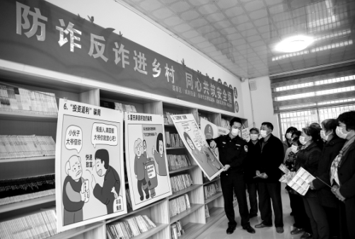 圖為在楊花橋村農(nóng)家書屋內(nèi),民警向老人宣傳電信詐騙、養(yǎng)老詐騙等防詐知識(shí),提升農(nóng)村老人識(shí)騙能力。