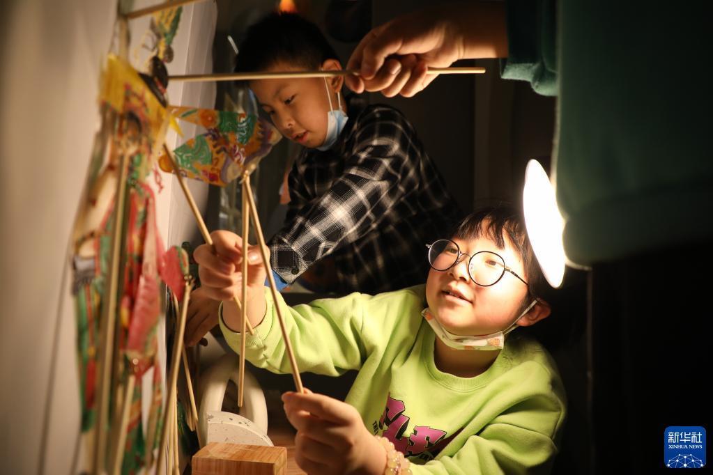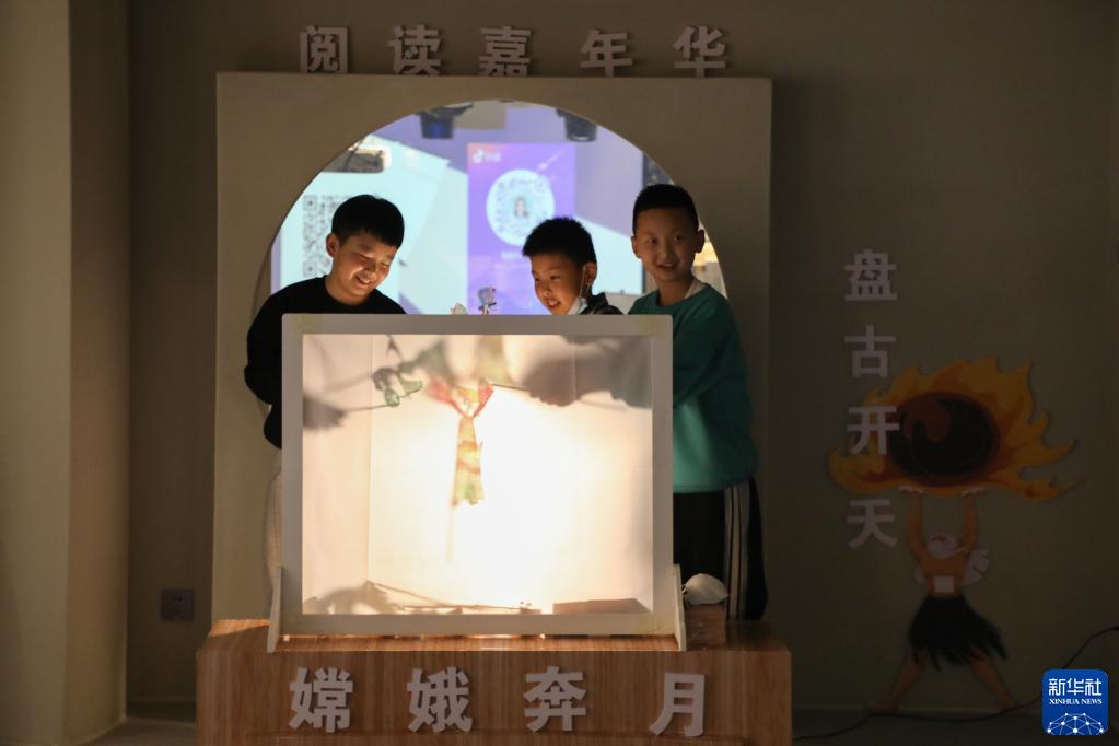 4月1日,在甘肅省蘭州市的讀者出版集團(tuán)數(shù)字閱讀中心讀者小站,小朋友體驗中國神話故事主題皮影戲。新華社記者 馬希平 攝