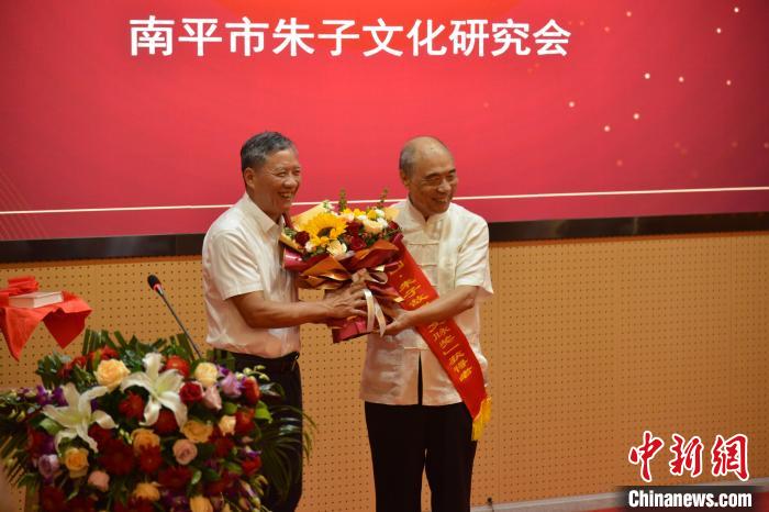 圖為第五屆“文脈獎”授予武夷文化研究院名譽(yù)院長吳邦才(右)。 葉國寶 攝