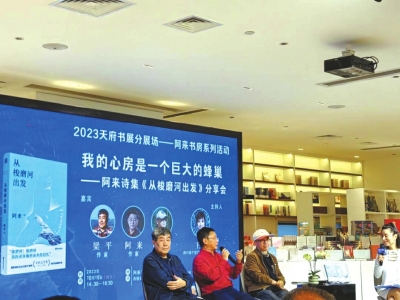 2023天府書展,各種名家分享會讓讀者應(yīng)接不暇。除了成都世紀城新會展中心主會場,分會場的活動也精彩紛呈。10月15日下午,在西部文化產(chǎn)業(yè)中心阿來書房,阿來、葉舟、梁平三位名家開啟“我的心房是一個巨大的蜂巢——阿來詩集《從梭磨河出發(fā)》分享會”。三人上演老友記,分享會由阿來的青春期談起,氛圍詼諧幽默、愜意深情。