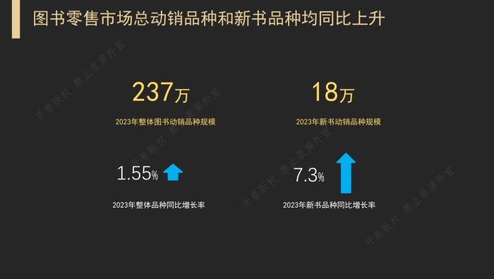 上述《報(bào)告》顯示,2023年整體零售市場(chǎng)總動(dòng)銷(xiāo)品種達(dá)237萬(wàn)種,同比上升1.55%,動(dòng)銷(xiāo)新書(shū)品種達(dá)18萬(wàn)種,同比上升7.3%。