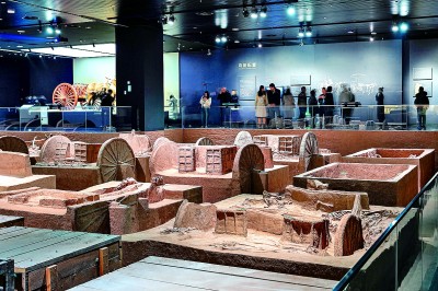 在二樓展廳展出的名為“陶”的文物,形狀呈圓餅狀,表面微微凸起,密密麻麻,這是商朝人洗澡時的清潔用具。殷墟考古發(fā)掘工作中,發(fā)現(xiàn)一種車,車前俯身埋著兩個人,這很可能是一種人力車,文獻稱為“輦車”。在“車轔轔,馬蕭蕭”展廳,社科院考古所現(xiàn)場考古,把發(fā)掘過程展示給游客。