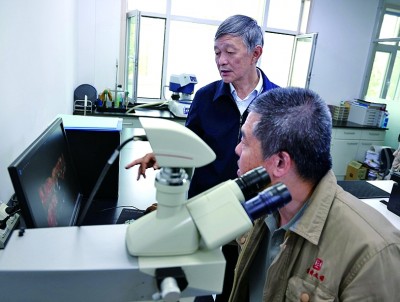 9月26日,敦煌研究院院長蘇伯民(左)與同事一起在實(shí)驗室觀察實(shí)驗數(shù)據(jù)。