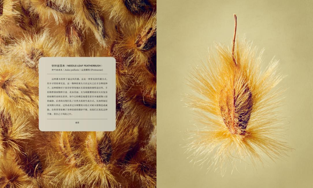 隨后,植物園耗時6個月,從3500份標(biāo)本中精心篩選出100種植物果實與種子。列文·比斯將這些攝影對象放大至80倍,捕捉到植物表面豐富多樣的細節(jié),照片的精細程度超乎想象。每張圖片還配有一段簡潔的科普文字,不僅反映了100多年來植物的采集狀況,展示了種子的傳播方式,還介紹了人類對植物材料的利用方法。