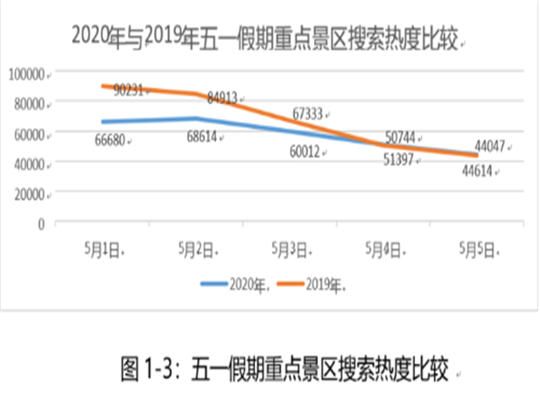 “五一”期間全省重點景區(qū)關鍵詞搜索熱度為29.1萬次,較去年同期33.7萬次下降13.6%。