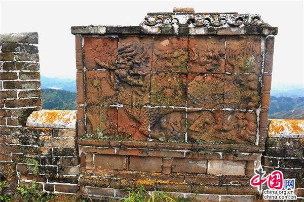 這是中國長城極為罕見、金山嶺長城的四絕之一:麒麟影壁。 它位于金山嶺長城東段的“小狐頂樓”之上。影壁墻高2米,寬2.5米,四邊鑲有磚框,中間用15塊(橫向5塊、豎向3塊)方磚,拼制成一幅浮雕的畫面,畫面中麒麟的神態(tài)動感十足,它腳踏祥云,挺胸翹尾,鬣毛飛揚,頭回扭,張口吐舌,雙眼望向身后樓櫓上的望亭,為金山嶺長城增添了幾分活力。