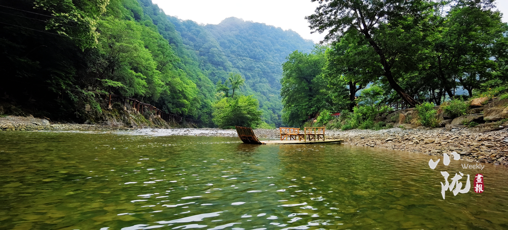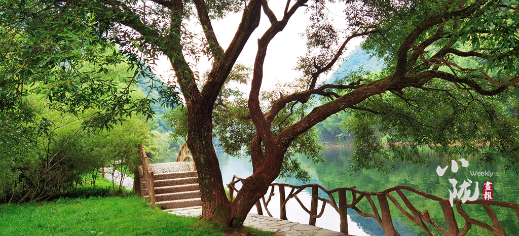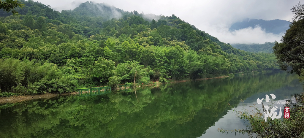 撐一葉竹筏在月牙潭之上,碧波蕩漾,山水一色,你能清晰的看見水底機(jī)靈的魚群,因你們闖入,驚慌的竄入沉積在水底的石縫中。遠(yuǎn)遠(yuǎn)望去,翠嶺逶迤,湖中碧波如鏡,嵐影倒懸,人在畫中游的意境躍然于心。