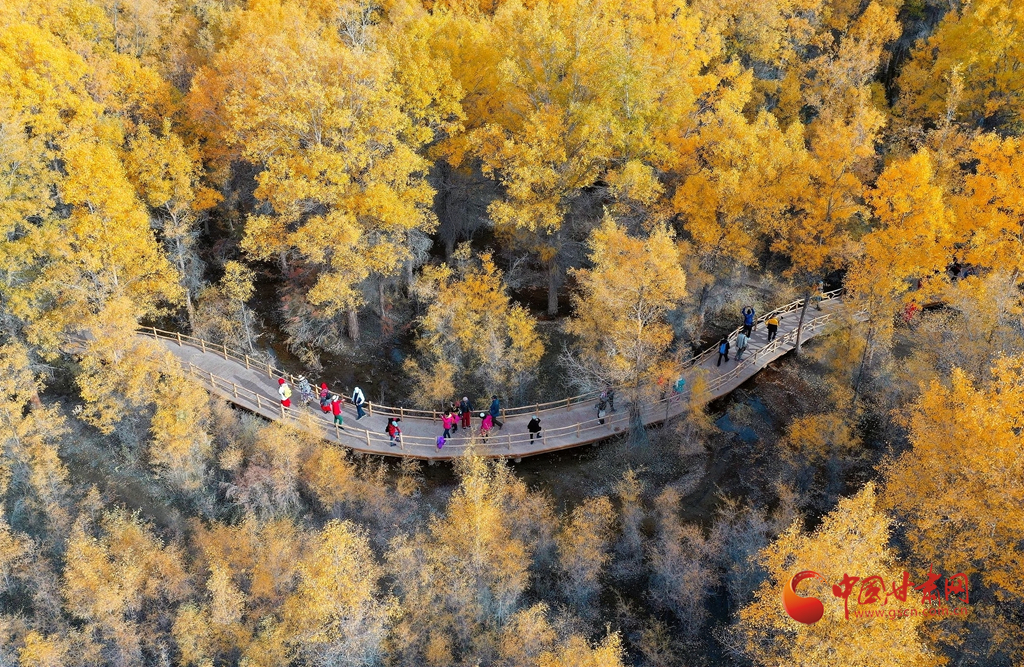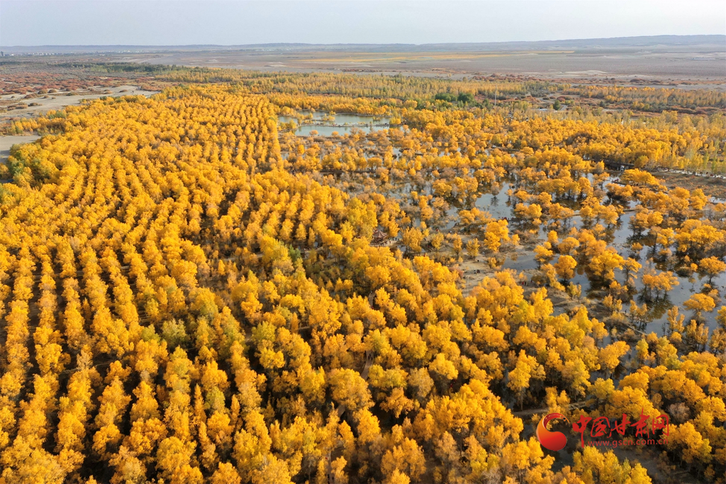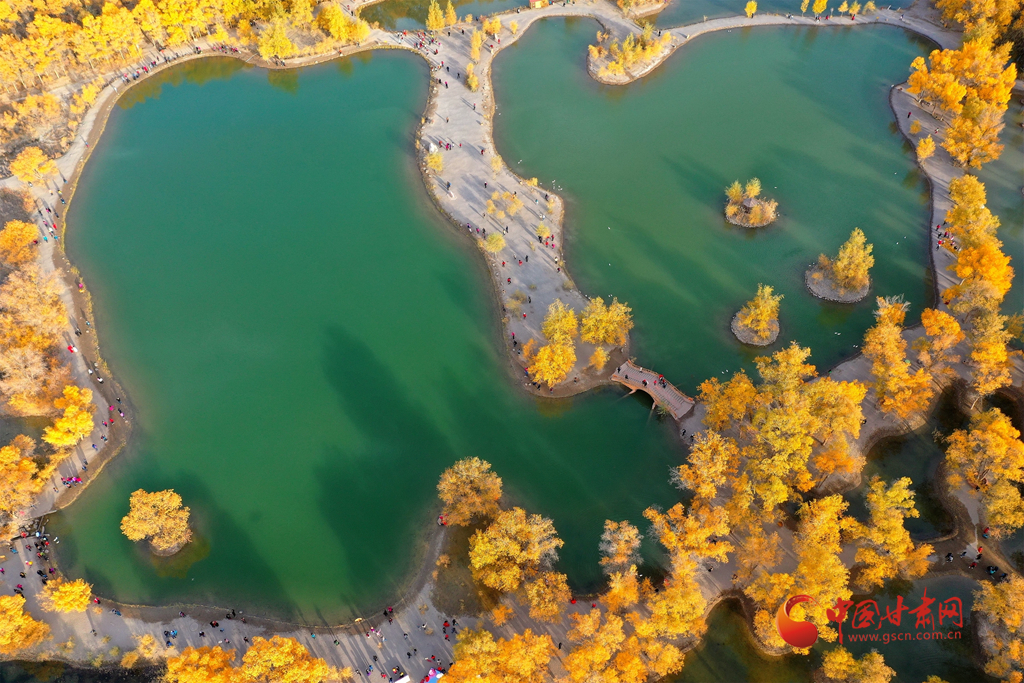 10月10日,在甘肅省酒泉市金塔沙漠胡楊林景區(qū),胡楊林在陽光的照耀下金黃燦爛,與湖水相映,令人流連忘返。(無人機(jī)照片)