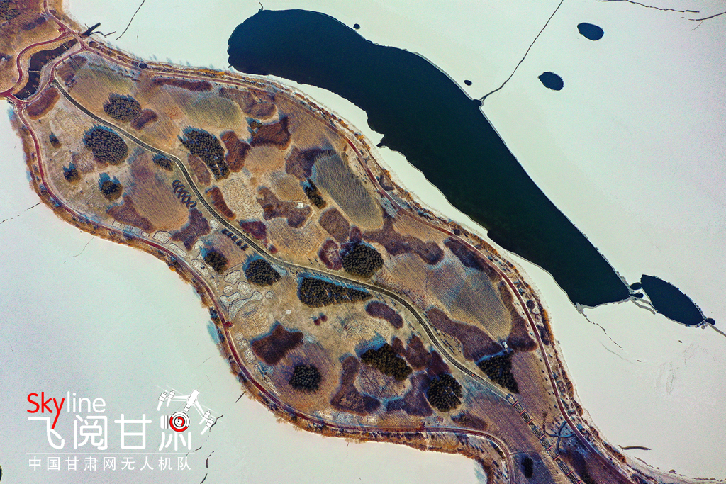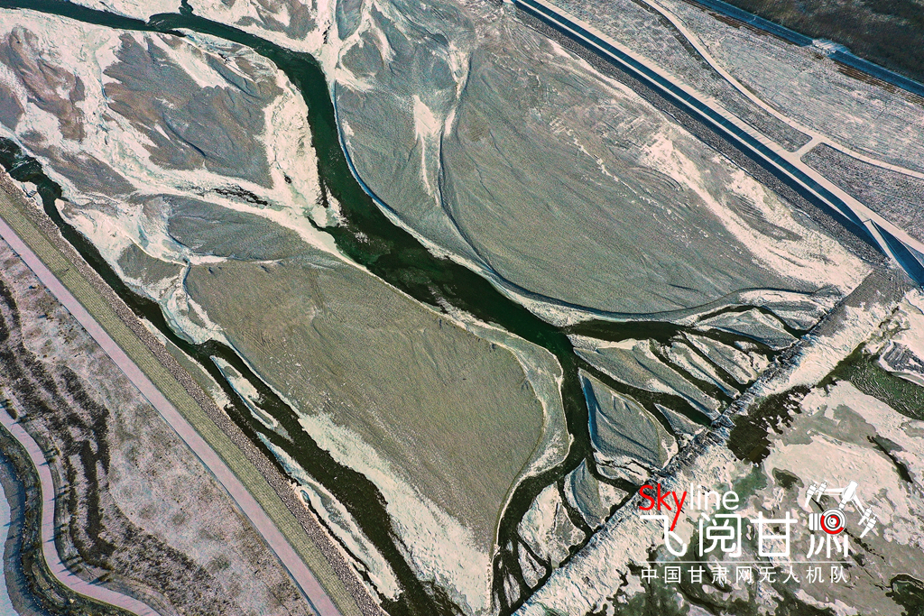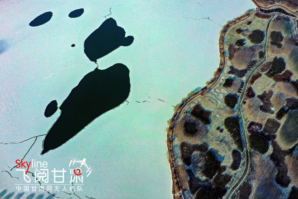 12月2日,雪霽天晴,冰封的黑河和漸凍的蘆水灣湖面上,皚皚白雪與裸露的水面形成丹青畫卷,別有一番趣味。(無人機照片)