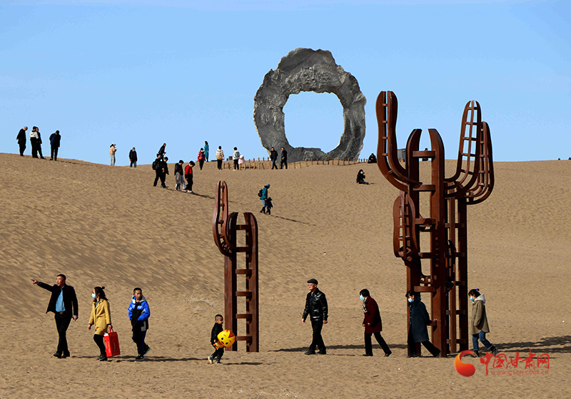 春節(jié)期間,甘肅省民勤縣蘇武沙漠雕塑藝術(shù)主題公園117件不同材質(zhì)、不同風(fēng)格的雕塑藝術(shù)佳作,高聳在靜謐的蒼穹之下,在茫茫沙漠中,與藍(lán)天白云相映成趣,盛迎四海賓朋前來觀光旅游,讓孤寂的沙漠,成為了熱門的“打卡地”。