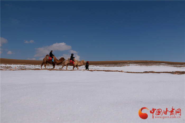 雪后的甘肅省敦煌市鳴沙山月牙泉景區(qū)景色如畫、銀裝素裹,美不勝收。