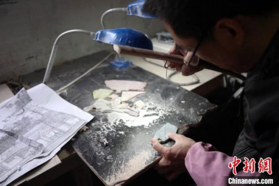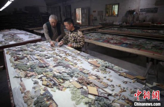 在瑞安市陶山鎮(zhèn)霞林村的陶峰工藝雕刻廠,彩石鑲嵌藝人李成者等人完成了彩石鑲嵌作品《清明上河圖》其中一部分。各色各樣的彩石流光溢彩,在工藝師傅的手中雕刻或拼接成一座座富麗堂皇的院落建筑,街道上絡(luò)繹不絕的車輛,集市上熙熙攘攘的人群……人物、場(chǎng)景栩栩如生,讓人嘆為觀止。