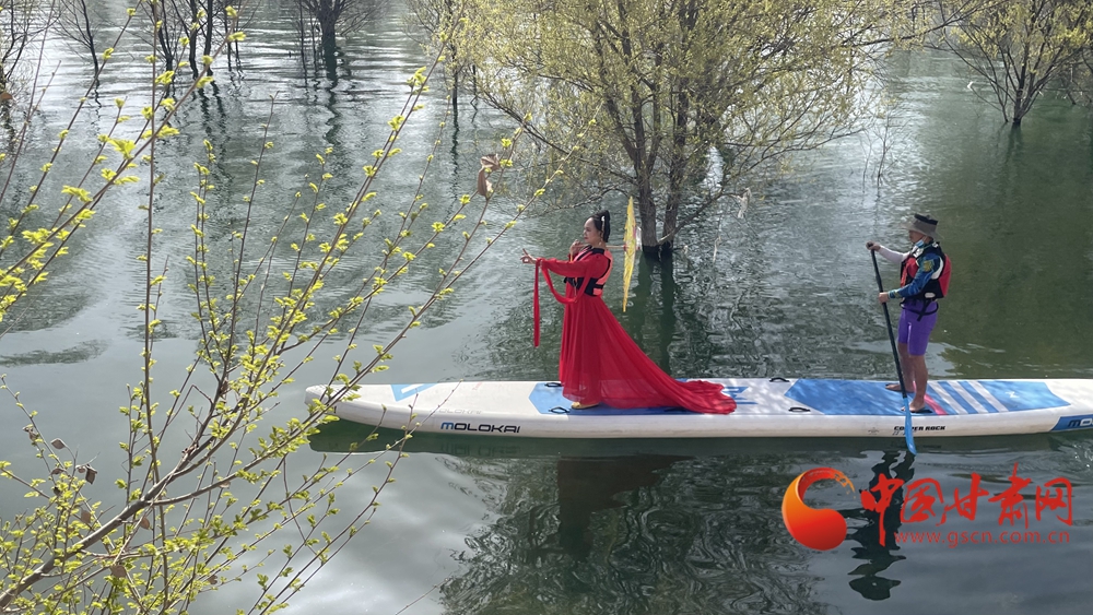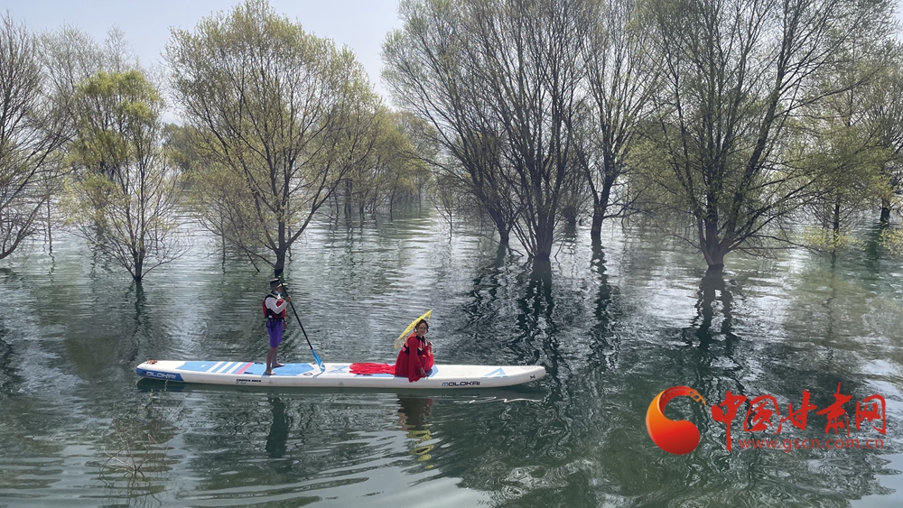 春日,炳靈湖水位上漲,碧波蕩漾,垂柳依依,槳板愛好者和游客在湖面上蕩舟嬉戲,游覽春色。