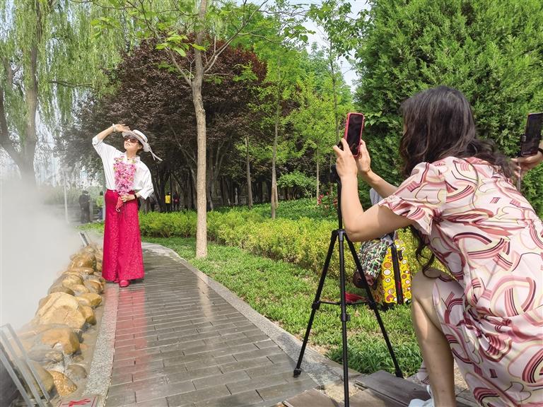 “一枝獨(dú)秀”團(tuán)隊(duì)的王大姐和姐妹們帶著專屬攝影師正在這里攝影留念。王大姐告訴記者,這是她們今年第2次來這里打卡。“這里的花真美,每年我們都會來,拍照發(fā)在網(wǎng)上,收獲無數(shù)點(diǎn)贊,心情別提多美了。”說話間,姐妹們又?jǐn)[了幾個造型,攝影師按下快門,精準(zhǔn)捕捉唯美瞬間。“4公里外的寓言故事園最近也特別火,過兩天我們就去打卡。”王大姐說。